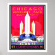 Afiche de viajes celebrando la Feria Mundial en Chicago Illinois del 27 de mayo al 1 de noviembre de 1933. Poster lee 1833 a 1933 Un siglo de Progreso y muestra rascacielos y edificios históricos de la Ciudad del Viento a lo largo de la costa del lago Michigan. Afiches de viaje retro de la tienda de arte mural.