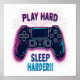 Reproducir duro de sueño más duro - La imagen presenta un ilustracion estilizado de un control remoto de juegos negro 4 contra un fondo blanco. El controlador se presenta en un estilo 3D con contornos de neón rosa y azul, creando un ambiente vibrante y enérgico. Las palabras "Reproducir duro" se muestran encima del controlador en una letra negrita y rosa neón, mientras que "¡Dormir más duro!" se escribe debajo en una fuente azul brillante.