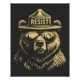 Un impactante ilustracion vintage de un oso realista con un gorra de ranger etiquetado RESIST y gafas de sol de un aviador reflejando un sereno pinar y una escena montañosa.