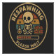 Press respawn and try again! This retro - style gamer emblem features a cute skeleton sitting patiently with an XP loading bar, treasure chest, and potion - all wrapped in a vintage badge layout. The bold test " Respawning - Please wait".