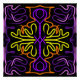 Patrón colorido y simétrico, púrpura, amarillo, naranja y rosa y formas sobre fondo negro