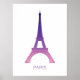 Este diseño presenta una Torre Eiffel abstracta de color púrpura y rosa.