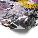 Una maravillosa mezcla de trazos de pintura, salpicaduras y marcas en una colorida paleta de color morado, rosa, azul, verde, amarillo, negro y blanco.