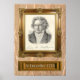 Un grabado de Beethoven, con su firma debajo, y un panel de madera que muestra la fecha de su nacimiento, sobre un fondo de mármol