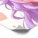 Un chica de estilo chibi con el pelo violeta esponjoso, ojos verdes brillantes y orejas de gato se representa en una pose irresistiblemente linda. Los cálidos tonos pastel y la expresión lúdica le dan un toque alegre e inocente.