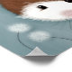 Una pintura digital de un caprichoso conejo blanco y marrón peludo se ve contra el fondo azul con textura de madera. Algunas malezas de dandelión blancas y esponjosas se ven a ambos lados del conejo. Hermosa pintura en colores suaves perfecta para cualquier área temática del bosque, ya sea una guardería para bebés, una guardería o una sala de juegos. Diseño original de Christie Black de Creaciones del Corazón.