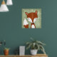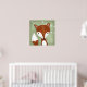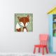 Un cuadro digital de un zorro caprichoso se ve en el fondo verde de madera. Se ven flores blancas en las viñas colgando en la esquina derecha. La hermosa pintura en tonos suaves es perfecta para cualquier área temática de bosques, ya sea un vivero para bebés, una guardería o una sala de juegos.