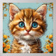 Gatito atigrado naranja adorable con grandes ojos azules, rodeado de flores delicadas y vegetación vibrante, sobre un fondo azul claro.