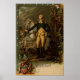 Retrato de George Washington vestido de uniforme, con un caballo blanco y un cañón. A continuación se muestra una breve biografía en esta postal de 1906.
