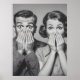 Impresionante retrato de estilo vintage en blanco y negro de una pareja sorprendida con expresiones de ojos anchos y manos que cubren la boca, capturando un ambiente retro clásico perfecto para posters, impresiones y amantes de la nostalgia.