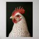 Retrato hiper realista de un pollo manchado con plumas rojas y blancas, peine detallado y batas, ambientado en un fondo oscuro.