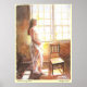 La luz del sol fluye a través de una ventana, iluminando a una joven con oro mientras se pone de pie y sueña con el futuro. Por el artista P Allingham Carlson, una nueva obra en acuarela.