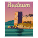 Poster retro del Castillo de Bodrum, resort de Turquía. Postal turística, pancarta, ilustracion