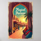 This retro travel poster invites viewers on an enchanting journey into the heart of a bustling Moroccan souk. Framed by a magnificent, intricately decorated archway, the scene unfolds under the warm glow of a setting sun, casting long shadows across the tiled pathway. Piles of colorful spices, from fiery reds to golden yellows and deep blues, overflow from traditional pottery, filling the foreground with an aromatic promise. Figures in flowing traditional attire subtly populate the market, adding to the authentic atmosphere. Beyond the immediate vibrancy, sun-drenched buildings with characteristic Moroccan architecture stretch towards a distant skyline, hinting at the depths of this ancient city. This artwork is special because it masterfully captures the sensory richness of Morocco – the warmth, the colors, the exotic allure – all rendered in a classic retro style. It's more than just a picture; it's an invitation to experience the magic and mystique of a vibrant culture, reminiscent of a golden era of travel and exploration.