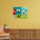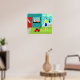 Welcome to Suburbia! This Retro Saturday Morning Poster features an attractive minimalist cartoon couple in their little corner of paradise. From the window of a turquoise and teal brick house, we can see Mrs. Homemaker. The beautiful redhead is wearing a hot pink frock. She is holding a pitcher of freshly squeezed lemonade in one hand. On the windowsill in front of her, there is a piping hot, homemade, lattice topped, fruit pie in a green pie plate. On the walkway, in front of the red door to the home, the rolled up Saturday morning newspaper is waiting to be read. Mr. Man of the House is standing on the lush green lawn. He is wearing a blue shorts and a yellow shirt that matches his wife's sunny disposition. He is standing behind a red lawnmower. We can see that he has already mowed a strip of grass, but, at this point, it's difficult to tell if he is working hard or hardly working. The mowing seems to be at a standstill while he enjoys a tangy glass of lemonade. Ah, refreshing! Beside the house, the family feline is perched on a white picket fence. Snowball, the ironically named black cat, is looking down on her loyal subjects and the orange and yellow flowers that border the fence row. The yellow sun is peeking from behind fluffy, light blue clouds. The sky is the shade of aqua reserved for Hometown, USA in kitschy, mid century modern artwork.