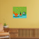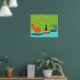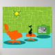 Se dice que los perros tienen propietarios y que los gatos tienen personal. ¡El felino en este Poster de la Era Retro Espacial Kitty no pudo estar más de acuerdo! El estilo de los años 60, de diseño artístico minimalista, cuenta con un elegante gato negro en una sala de estar moderna de mediados de siglo. La sofisticada sala cuenta con una pared de piedra verde. La moqueta es aqua con sombras verde azuladas. El mobiliario de la habitación incluye una luz amarilla y sputnik, una tumbona naranja con una banqueta a juego y un televisor verde con orejas de conejo. El afortunado gato negro se puede ver encaramado en el taburete delante del televisor. ¡Su programa favorito está! En la pantalla de televisión podemos ver a una familia de televisión clásica en blanco y negro resolviendo todos los problemas de la vida en un programa de media hora. Este diseño es perfecto, si lo decimos nosotros mismos.