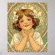 Illustration art nouveau d'une enfant avec des fleurs blanches dans les cheveux, dans un cadre ornementé de rinceaux