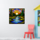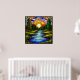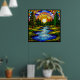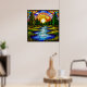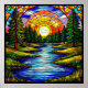 Una colorida obra de arte de cristal teñido muestra un pintoresco río que fluye por un bosque bajo una puesta de sol radiante.