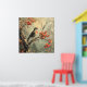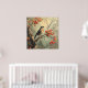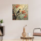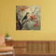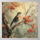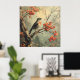 Hermosa litografía vintage natural de un pechuga romana en una rama de árbol con flores rosas y bayas rojas, suaves y delicados colores al estilo japonés