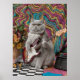 Un gato británico de Shorthair está tocando la guitarra con un fondo psicodélico.