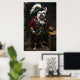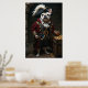 Esta impresionante imagen muestra un Bulldog francés blanco con manchas negras, magníficamente vestido como capitán de un pirata. Lleva un gorra de tricornio de plumas y un abrigo rojo elaborado con un adorno dorado brillante. Debajo, un chaleco azul con detalles dorados y un blanco y espumoso jabón completan el distinguido uniforme. El regal canino se encuentra con confianza junto a un cofre del tesoro abierto rebosante de oro, que encarna a un explorador serio y aventurero.