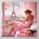 Add a touch of luxury to your home decor with A dreamy painting of an elegant woman in a flowing pink dress seated by a window overlooking the Eiffel Tower, surrounded by pink cherry blossoms and a soft pastel sky—capturing a poetic Parisian mood for adding a touch of sophistication, romance, and feminine charm to home decor.