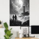 Esta poderosa obra de arte monocromática representa a una pareja romántica parada en la orilla de una tormenta, mano a mano, con un faro brillando en el fondo. El estilo inspirado en el carbón vegetal y la composición dramática evocan temas de amor, resiliencia y esperanza, lo que lo hace perfecto para San Valentín, aniversarios o decoración elegante y romántica.