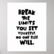 Empuje más allá de sus límites con este poderoso poster motivacional que presenta la audaz declaración, "Rompe los límites que usted mismo establece. Nadie Más Lo Hará". La atractiva tipografía y el mensaje impactante son perfectos para recordarte que los límites autoimpuestos están destinados a ser destruidos. Ideal para espacios personales, oficinas, gimnasios, o en cualquier lugar que necesite un impulso de confianza y determinación. Una gran pieza para inspirarse a sí mismo y a otros para tomar el control y superar los desafíos.