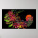 Resumen de la imagen brillante de un gallo con ojos azules admirando su magnífica y hermosa cola. Poster para El día de San Valentín, cumpleaños u otra ocasión. Impresionante pintura moderna del autor para su casa o como regalo.