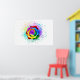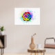 Rosa grande y floreciente con pétalos de arco iris sobre fondo blanco, pintado con salpicaduras de pintura colorida y brillante. 3.ª