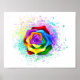 Rosa grande y floreciente con pétalos de arco iris sobre fondo blanco, pintado con salpicaduras de pintura colorida y brillante. 3.ª