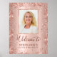 Elegante purpurina de oro rosa moderno metálico y Poster de señas de bienvenida con foto personalizada 65º cumpleaños. Este letrero de fiesta de cumpleaños Girly Adulto SESENTA Y CINCO O CUALQUIER EDAD presenta una elegante escritura caligráfica escrita a mano, un fondo de Relieve metalizado metálico rosa o rosa falso de oro cepillado con marco purpurina de vidrio suelto alrededor. Ideal para una celebración de cumpleaños femenina adulta o de hitos de niñas, esto capta perfectamente la esencia de una moderna fiesta de cumpleaños de mujeres brillantes de oro rosa o purpurina rosa brillante y lustre.