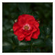 Fotografía de una rosa roja en un jardín. La flor está completamente abierta, exponiendo los tallos amarillos del centro. Detrás de la flor principal crece un par de cuerdas rojas. El fondo está lleno de hojas verdes. Derechos reservados ©Kimberly J Tilley.
