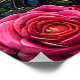 Rosas vibrantes en flor rodean una luna llena contra un cielo estrellado y melancólico, realzado por gotitas de agua que simbolizan una mezcla de belleza, tranquilidad, naturaleza y un ambiente de ensueño.