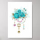 Llave de oro antiguo con rosas turquesa de moda decorados con hojas de oro blanco y cuentas rosas y azules. Color de moda. Rosas turquesas. Oro blanco. Tifanía azul.