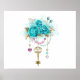 Llave de oro antiguo con rosas turquesa de moda decorados con hojas de oro blanco y cuentas rosas y azules. Color de moda. Rosas turquesas. Oro blanco. Tifanía azul.