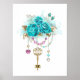 Llave de oro antiguo con rosas turquesa de moda decorados con hojas de oro blanco y cuentas rosas y azules. Color de moda. Rosas turquesas. Oro blanco. Tifanía azul.