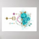 Llave de oro antiguo con rosas turquesa de moda decorados con hojas de oro blanco y cuentas rosas y azules. Color de moda. Rosas turquesas. Oro blanco. Tifanía azul.