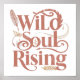 Embrace your inner spirit with this "Wild Soul Rising" graphic. Featuring elegant script typography in earthy rose gold tones accented with delicate feathers, this boho-chic look is perfect for free spirits, yoga lovers, and anyone on a spiritual journey.