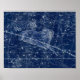 Aries zodiac firma ilustracion gráfico vintage con estrellas y constelaciones en un fondo azul oscuro.