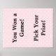 ¡Ganaste un partido, escoge un premio! Eso es lo que dice este cartel. Es bueno para juegos de ducha para bebés, o para bodas o cualquier juego de fiesta. Rosa con lunares blancos.