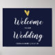 Elegante Relieve metalizado de imitación dorada corazón bienvenida signo boda con escritura blanca moda en un fondo azul marino.