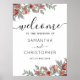 Señal de boda moderna y elegante con escritura de escritura a mano negra simple y elegante sobre fondo blanco, y con elementos florales de terracota rústica. Personalizar con sus detalles únicos.