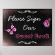 Negro y rosa "Por favor, firma nuestro Libro de invitados" boda negro firma falso cartel de pizarra de tiza.