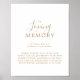 Esta señal mínima de boda de memoria dorada es perfecta para un simple boda. El moderno diseño romántico presenta una tipografía clásica en oro y blanco, acompañada de una caligrafía rústica y elegante con un estilo de letra a mano vintage. Personalizable de cualquier color. Mantenga el diseño simple y elegante, tal como está, o lo personaliza añadiendo sus propios gráficos y obras de arte.