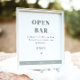 Este letrero de barra abierta imprimible presenta un diseño minimalista moderno con tonos verde sabio. Utilice esta plantilla para cambiar las fuentes, los colores de fuente y el color de fondo para que coincidan con el estilo de evento.