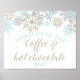 Invierno de Onederland primer cumpleaños calentarse en el cartel de café y chocolate caliente con copos de nieve azules y dorados.