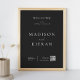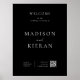 Este elegante cartel de poster de bienvenida para bodas presenta un diseño minimalista con líneas depuradas y una estética moderna. El texto está centrado y enmarcado con un delgado borde negro, proporcionando un aspecto pulido y sofisticado. El poster da la bienvenida a los invitados a la ceremonia de boda y destaca los nombres de la pareja con letras atrevidas y de diseño, creando un punto focal sorprendente. En la parte inferior, el signo incluye la fecha y la ubicación del boda en un tipo de letra pequeño y refinado. En la parte inferior derecha hay un código QR que invita a los clientes a escanear y ver digitalmente el programa de bodas, añadiendo un toque contemporáneo al diseño clásico. La disposición general es elegante, sencilla y eficaz, perfecta para un boda moderno.