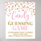 Dulce adivinando poster de signos de juego para la ducha de bebé con un patrón de confeti rosa claro y dorado. Tenga en cuenta que el efecto purpurina es sólo efecto fotográfico.