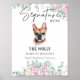 El encantador cartel de la firma de los perros de Bulldog francés incluye un hermoso diseño de mascota floral al estilo de las acuarelas, perfecto para un boda saturado de tonos neutros. Es una forma atractiva de acentuar el cóctel, la comida o la mesa de postres. Personalice el cartel de la barra del boda con el nombre del mascota y los detalles de la bebida.